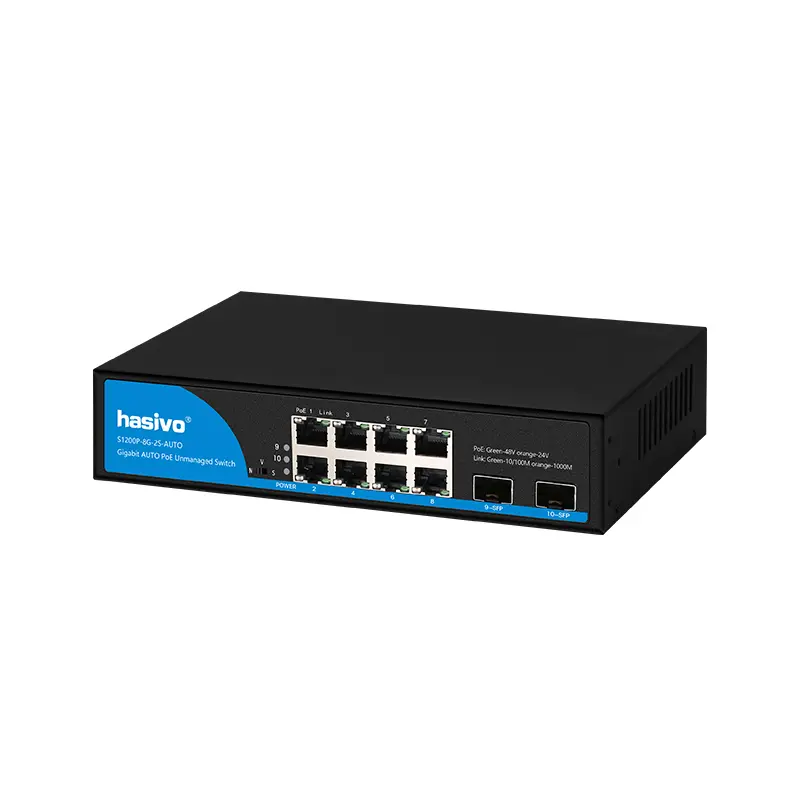 S1200P-8G-2S-AUTO is a newly launched gigabit unmanaged PoE switch by Hasivo, which complies with the international PoE universal standard IEEE802.3af/atPoE++/HiPoE. It can automatically detect and power devices that comply with the IEEE802.3af/atPoE++/HiPoE standard. The first port supports HiPoE 30W output, solving the problem of camera, wireless AP and other devices crashing and disconnecting, and achieving fully automatic repair after crashing; Simultaneously solve the issue of restarting the switch on site once a month; Resolve the installation requirements for multiple switches.