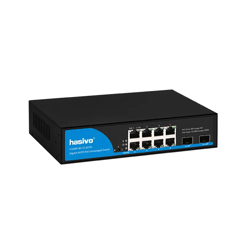 S1200P-8G-2S-AUTO is a newly launched gigabit unmanaged PoE switch by Hasivo, which complies with the international PoE universal standard IEEE802.3af/atPoE++/HiPoE. It can automatically detect and power devices that comply with the IEEE802.3af/atPoE++/HiPoE standard. The first port supports HiPoE 30W output, solving the problem of camera, wireless AP and other devices crashing and disconnecting, and achieving fully automatic repair after crashing; Simultaneously solve the issue of restarting the switch on site once a month; Resolve the installation requirements for multiple switches.
